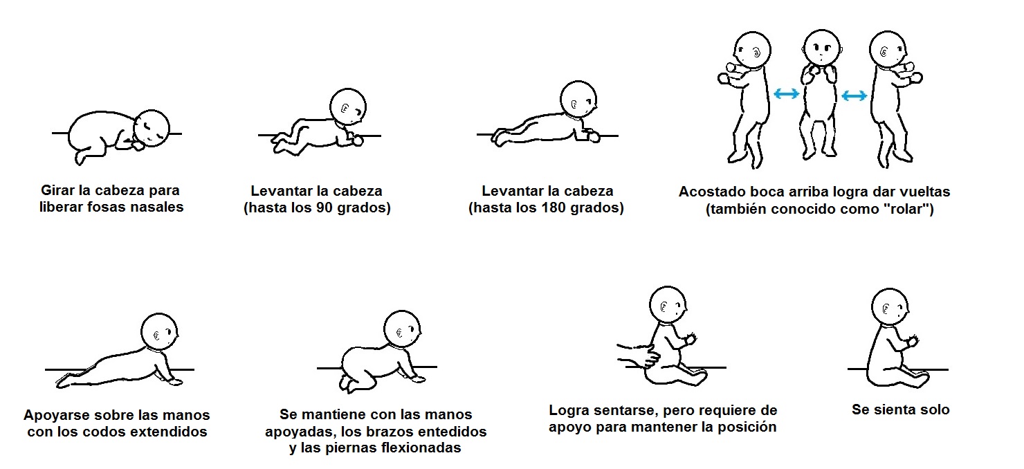 Este paso a paso incluye el control cefálico o sostén de la cabeza, que se logra alrededor de los 2 o 4 meses. Luego viene su capacidad para girar hacia un lado y hacia el otro, a los seis meses, y sentarse con ayuda y posteriormente sin ella, más o menos a los 7 u 8 meses, cuando tienen un adecuado equilibrio del tronco.